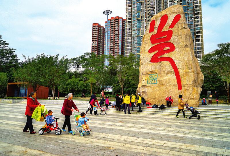 南宁市围绕“治水、建城、为民”打造“百里秀美邕江”,集防洪和饮用水源保护、提高通航能力、改善提升水质、水资源开发利用和景观建设于一体,让市民出门即进公园。图为市民在邕字碑人文景观附近游玩。(薛秀云摄)