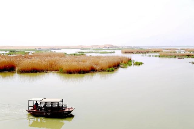 碧波荡漾的沙湖旅游景区,沙与湖相依相偎。
