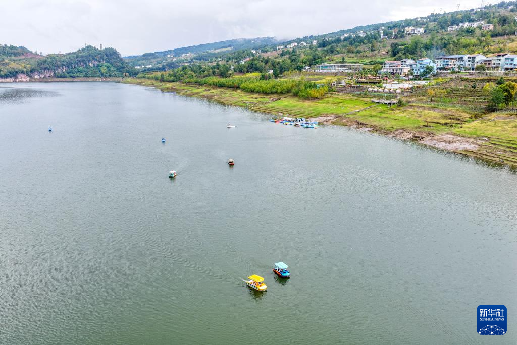 10月15日,游客在湿地公园湖上乘船游玩(无人机照片)。