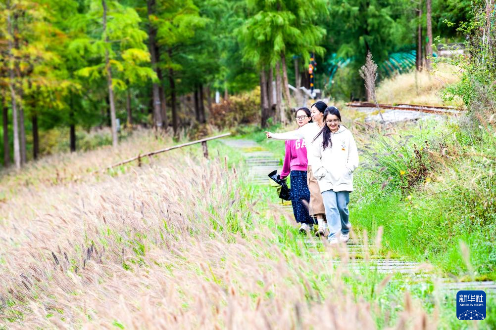 10月15日,游客在湿地公园湖畔步道上游玩。