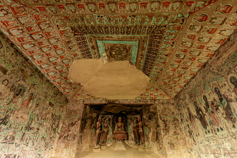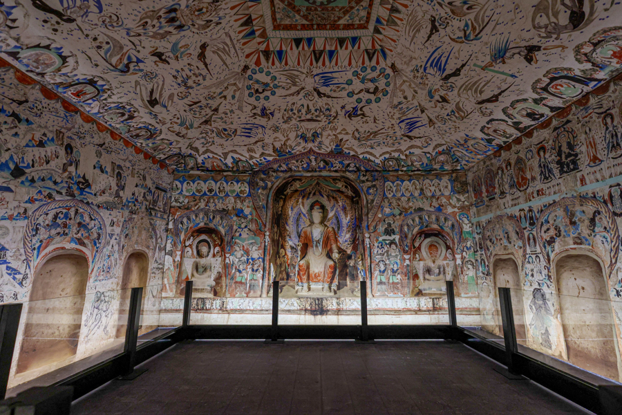 复制窟方面,“敦煌最大中心塔柱窟”北周第428窟的现身,最令人惊喜。此窟主室面积达178平方米,保存有敦煌石窟中最多的供养人画像和最经典的佛本生故事画——萨埵太子舍身饲虎。其形制也颇具特色,中心塔柱源自印度的“支提窟”,而顶部前半部分却是中国传统建筑的人字披形顶,尽显莫高窟的“中西交融、兼容并蓄”。
