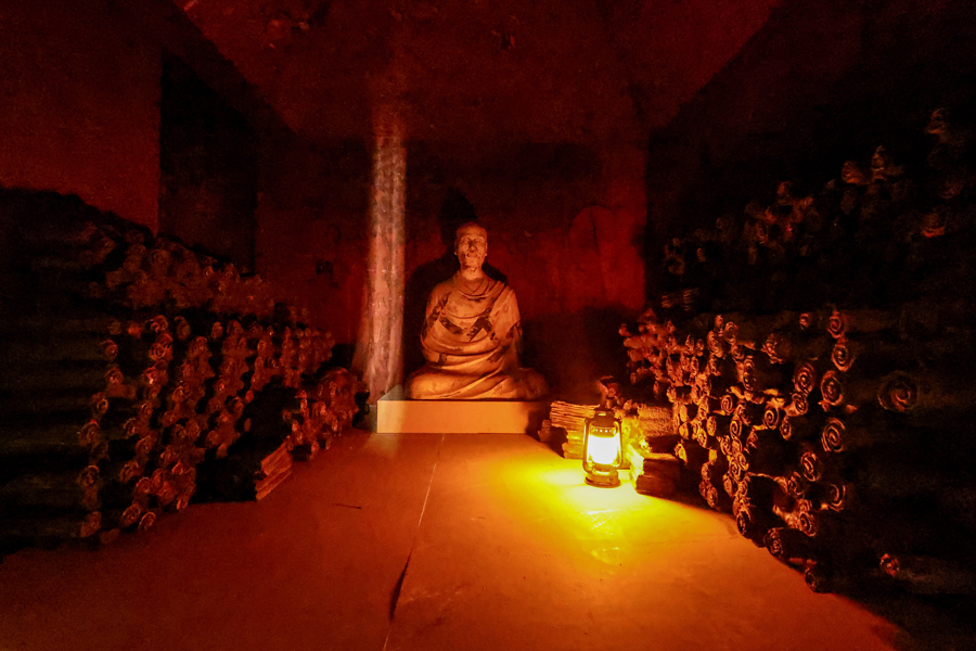 发现数万件文物、被誉为“藏经洞”的晚唐第17窟,在此次展览中以别样的方式“回归”。这是一处只能窥见却不能走进的洞窟——展方特意在洞窟上凿开了一个洞,让观众透过这一洞口,窥见敦煌僧统洪辩的塑像,以及堆得满满当当的经卷,恰如当年藏经洞被发现时的视角。