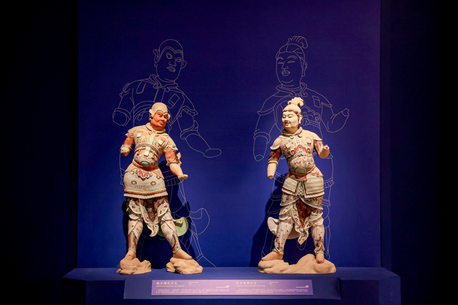 蓝色展墙一一铺展以隋唐时期为主的莫高窟中期艺术风貌。这一时期的壁画彩塑恢弘大气,体现出世俗与理想的融合、艺术风格的中国化与成熟,构图均衡宏大,色彩体系空前丰富、金碧辉煌,题材以经变画、净土信仰和供养人等为主。从展出的《十一面观音图》《说法图》《四飞天》等壁画,威武雄壮的“北方多闻天王”、喜乐亲切的“南方增长天王”等彩塑等,不难觉察这样的风貌。