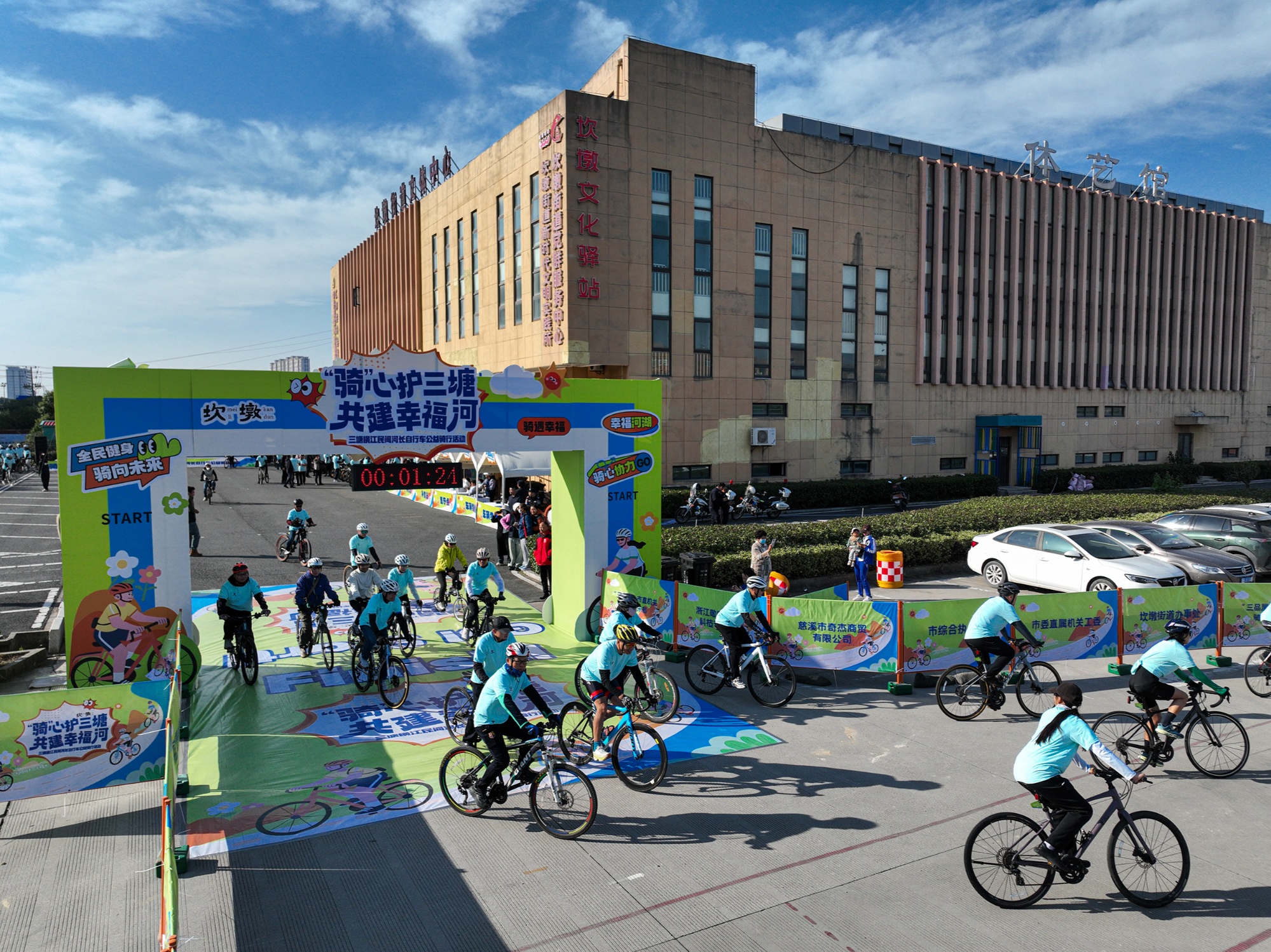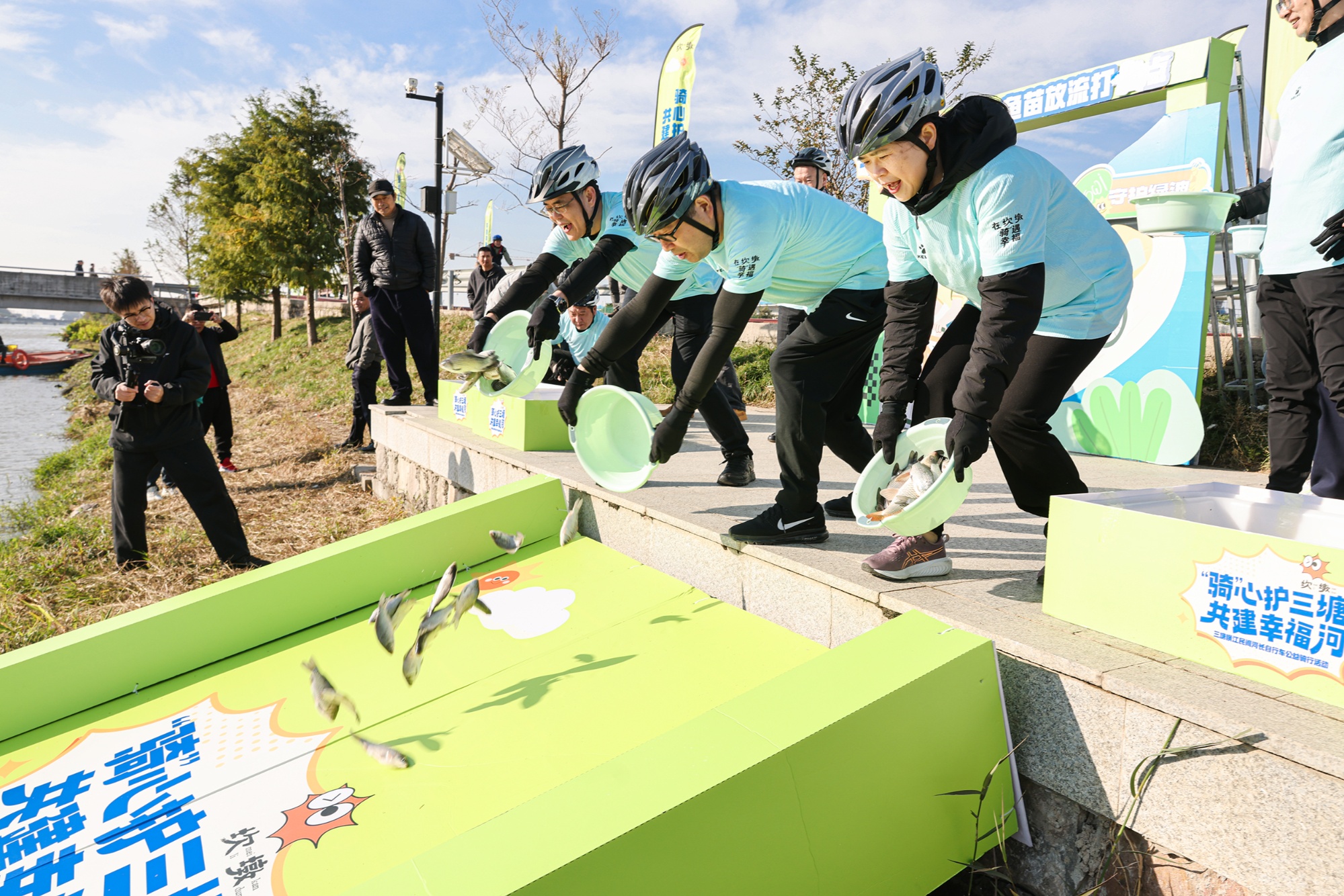 当天14时30分,发令枪响,骑行队伍分批出发,一场以“‘骑’心护三塘 共建幸福河”为主题的生态之旅就此展开。骑行者们沿三塘横江15公里的环形绿道破风前行,实地感受流域治理与生态建设成果。途中设置的鱼苗放流点吸引骑行者踊跃参与,大家在领略江岸风光的同时,亲手投放鱼苗,以实际行动助力水生态修复,生动诠释了“骑行+巡河”的绿色公益理念。
