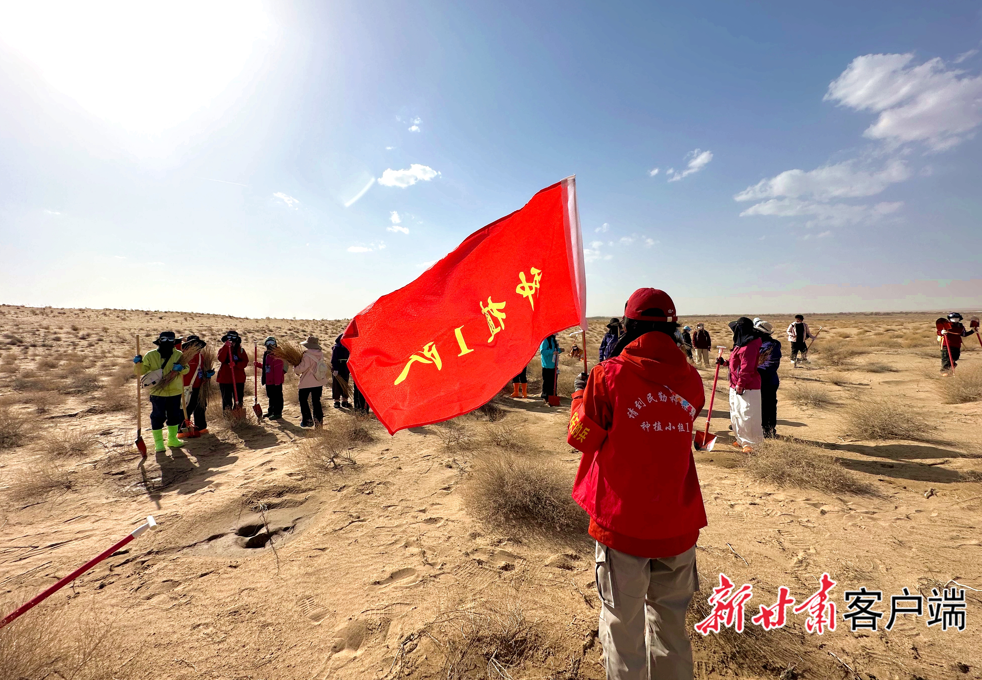 三月的民勤县收成镇兴隆村公益治沙造林基地,绿意萌发,满目生机。每天清晨,一队队操着不同口音、朝气蓬勃的青年志愿者,高擎志愿旗帜,扛起铁锹,抱着树苗,浩浩荡荡奔向沙漠腹地。